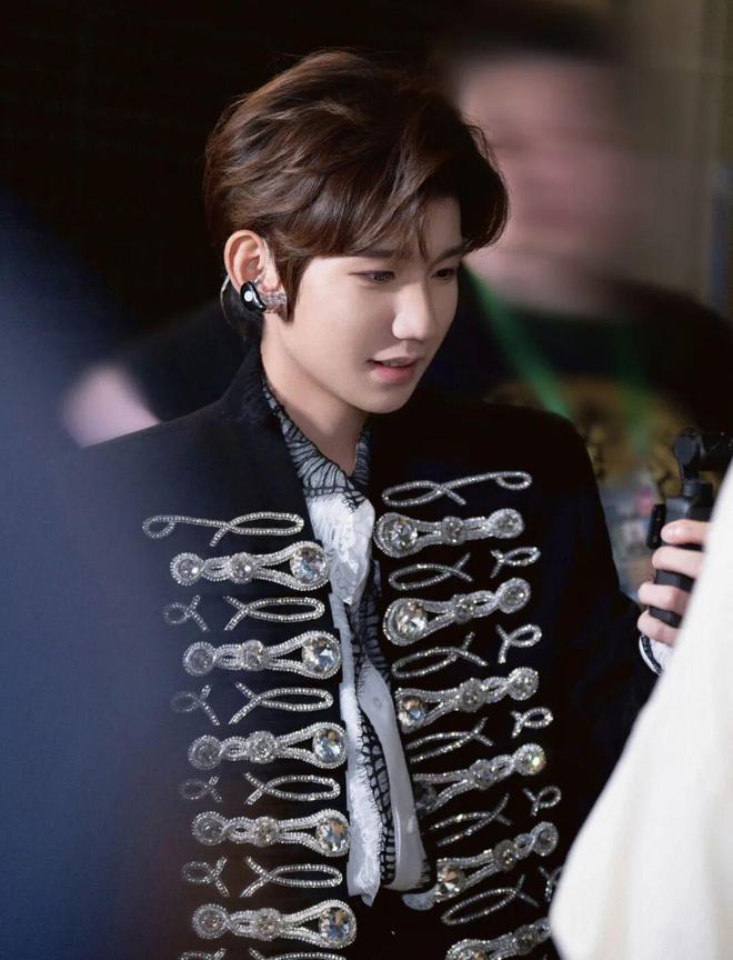 王源在同节目中身着Balmain 2025早秋男装系列拿破仑风格西装出场,内搭白色蕾丝衬衣,两条黑色荷叶边镶嵌在胸前,硬朗肩线与柔软褶饰形成极具张力的对撞感,让贵族式军装美学拥有了更轻盈的呼吸。