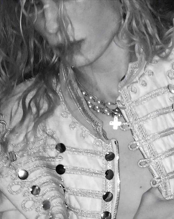 在Future Nostalgia视觉影像中,2Hollis的白色拿破仑套装通过金属扣饰和金色刺绣重写传统军装庄重感,金发与白制服形成高反差,让整套造型拥有“超现实雕像”般的疏离气场。这不是军装,是未来感符号。