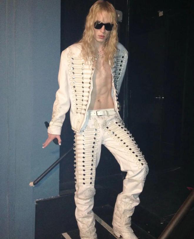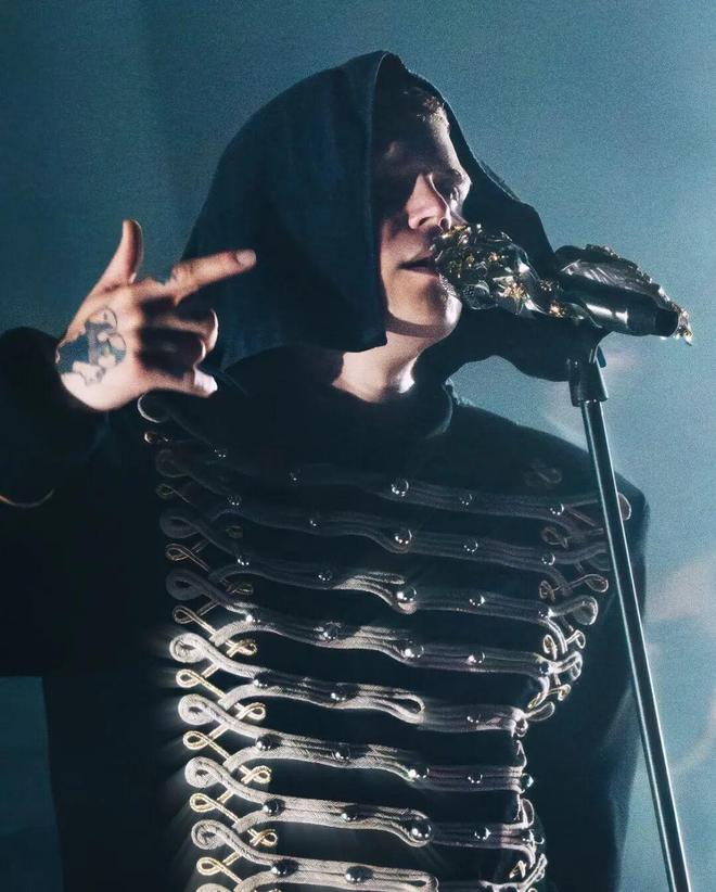 芝加哥 Bliss 舞台上,Yung Lean身穿Celinenordal黑色拿破仑夹克。米白扣带、金线刺绣让黑色基底呈现出“夜间咒语”般的层次,立领撑出挺拔骨架。