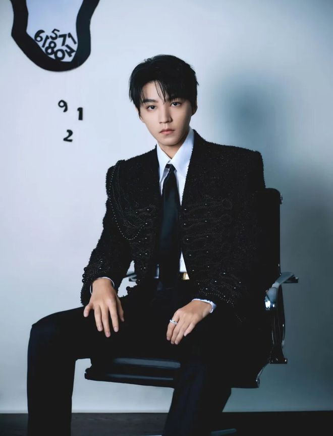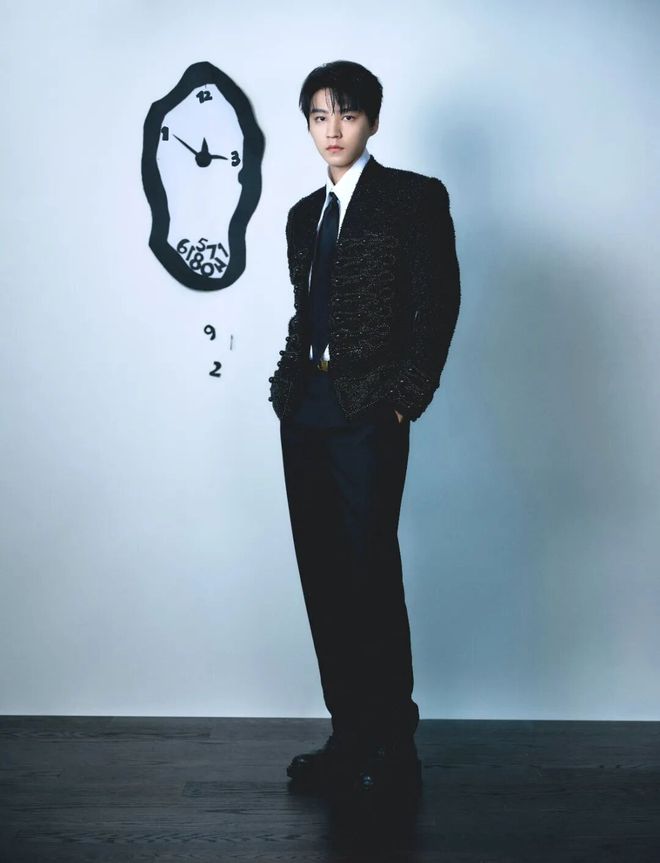 今年6月的上海国际电影节红毯,王俊凯穿上Balmain 2025 Pre-Fall黑色花呢拿破仑夹克。坚挺肩线、立领、收腰共同构成“贵族式直线美”。搭配Helen Anthony衬衫和Christian Louboutin鞋履,点缀DeBeers戒指,每一步都是年轻贵族的步伐。