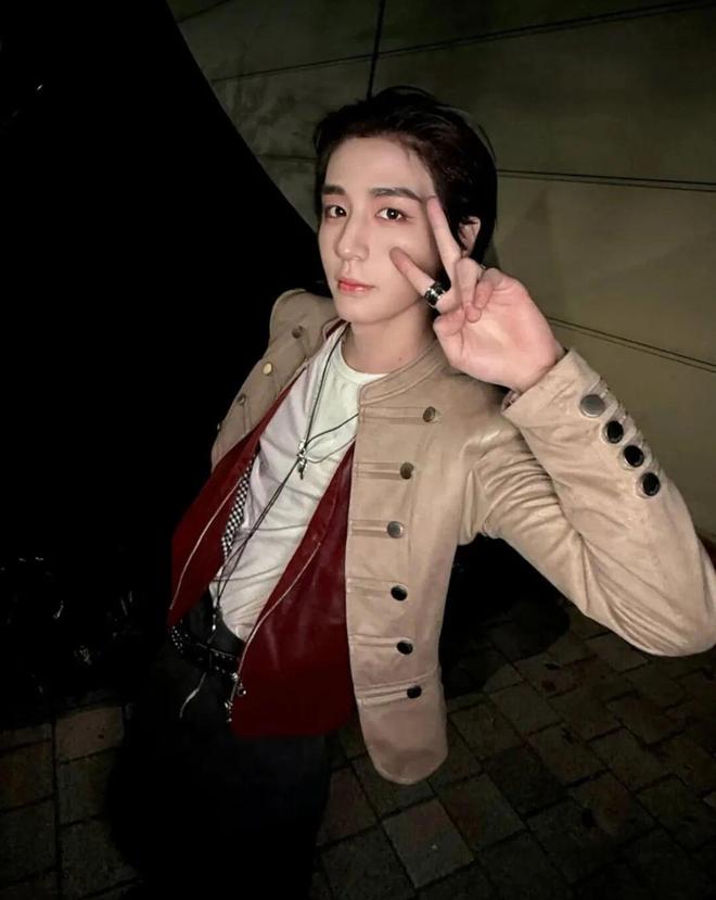 BOYNEXTDOOR的金桐儇CMF音乐节中上身SCULPTOR拿破仑夹克,外套硬朗轮廓 × 红色皮衣 × 白 T,形成三段式视觉冲击,铆钉腰带随着节奏甩出音频般的弧线,把街头叛逆直接推上高清舞台。