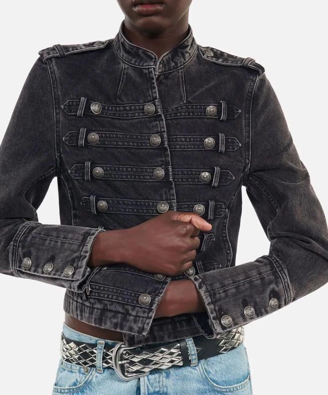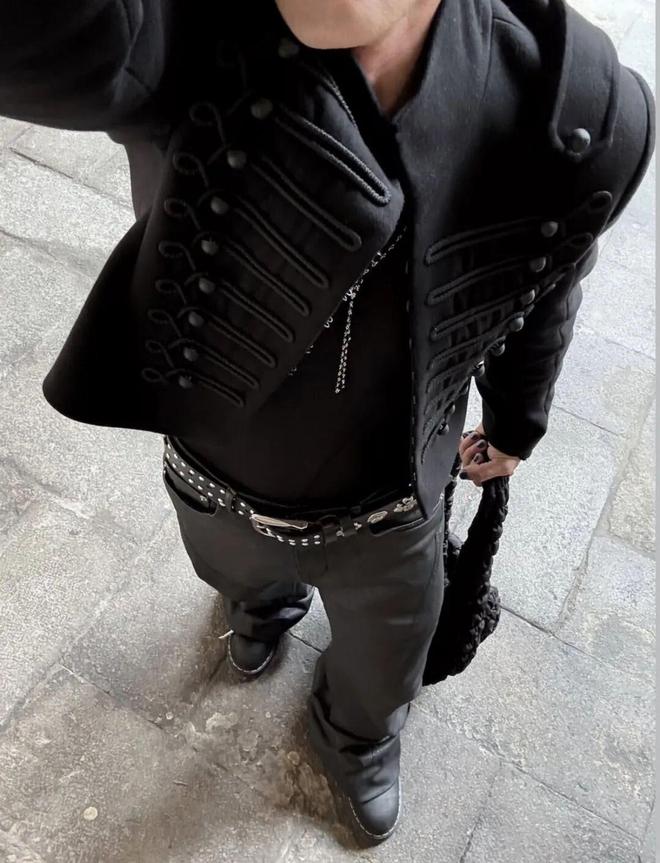 黑色短款拿破仑夹克是造型的锋利来源——金属排扣复刻军装英气,短款长度露出一截腰线;露出的腰边让本来严肃的军装多了一丝街头随性。修身黑牛仔+短靴拉出干净直线,深色系自带“腿长滤镜”。