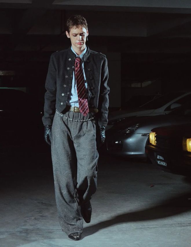 金属扣与肩章复刻军装英气,短款卡腰线上方拉长比例,衬衫+红纹领带让正式感滑向街头,宽腰带与金属链点睛,垂坠灰阔腿裤扫平腿型小烦恼,黑皮手套与旧皮鞋增添凌厉感。