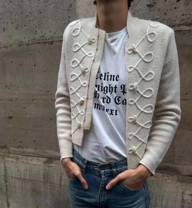 拿破仑夹克最吸睛的就是绳结绑带——复古工艺细节被轻轻点亮。米白色又把军装的硬朗柔化成慵懒氛围。内搭字母白 T+浅蓝牛仔,顺色清爽、氛围松弛。