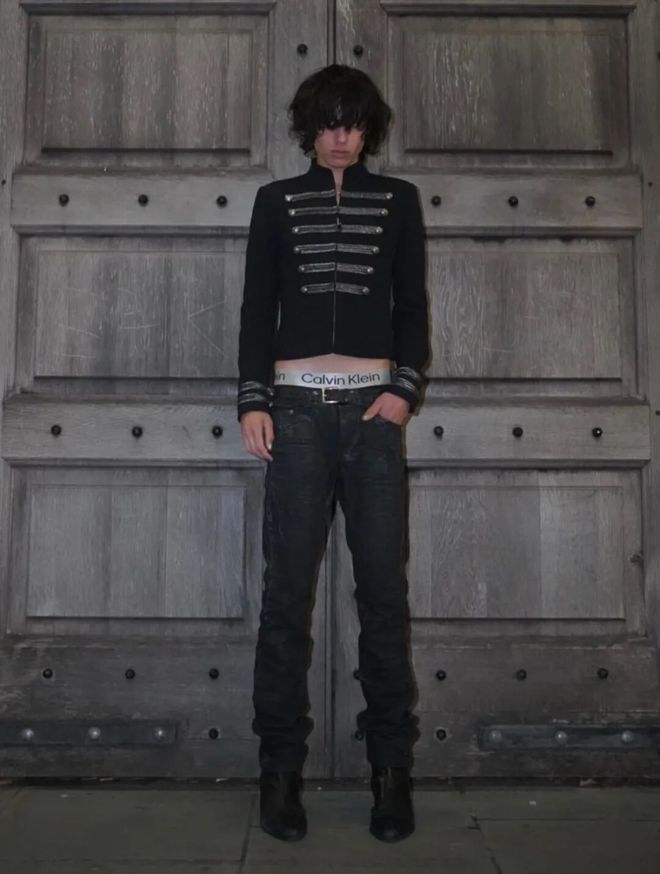 自带金属排扣与编织纹路的藏青短夹克,是拿破仑军装元素现代复刻。硬挺轮廓压住内搭蕾丝衬衫的柔软,露腰设计拉长比例,搭配垂坠灰阔腿裤与金属腰链,宫廷华丽与街头灵动平衡。尖头皮鞋和冷冽线条让整体造型干净利落。