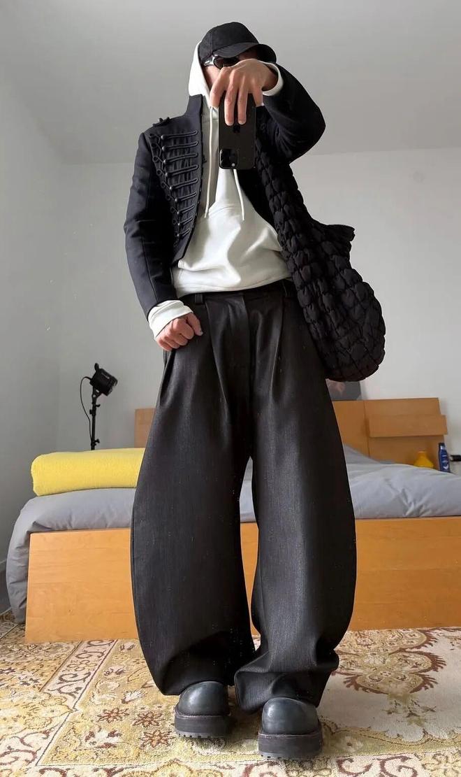 黑色短款拿破仑夹克的绳结排扣撑住军装的精致感,叠穿白色连帽卫衣,让原本的锋利瞬间软化成慵懒街头气。搭配超阔腿黑裤+厚底鞋,“短上宽下”的组合藏住所有腿部小细节,厚底鞋再拉一寸视觉比例。